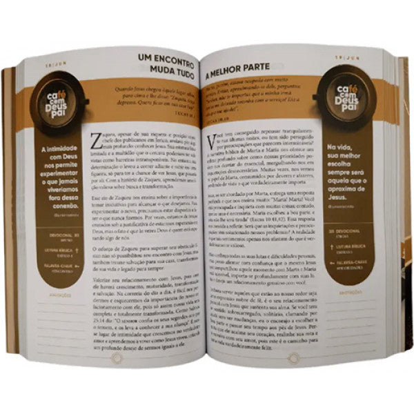 As páginas interativas irão envolvê-lo ainda mais nessa jornada, permitindo que você reflita, anote suas inspirações e compartilhe suas experiências. A cada dia, você encontrará uma mensagem única e significativa, especialmente selecionada para nutrir sua alma e fortalecer sua fé, proporcionando motivação e encorajamento. E para aqueles que desejam se aprofundar ainda mais na Palavra de Deus, também é incluso um plano de leitura bíblica, que o guiará por uma jornada de conhecimento e descoberta.